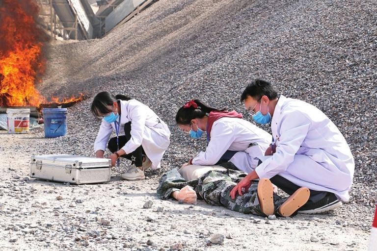 演练现场模拟永登县境内发生4.8级地震后,秦川园区某非煤矿山露天采场边坡发生坍塌滑坡,其中一台刷坡作业的挖掘机被崩塌的矿体掩埋,1名驾驶员受伤被困于驾驶室内,1名维修作业人员从高处坠落摔伤,1名工作人员避险时惊慌失措掉入生活区蓄水井内,一辆自卸货车急于驶离,扬起的车斗与高压电线触碰,造成车辆起火,驾驶员撤离时被跨步电压击倒的情景。接到报告后,园区应急指挥中心按照《兰州新区秦川园区生产安全事故应急预案》启动应急响应,组织抢险救援人员立即进行现场救援,各应急指挥部成员单位围绕各自职责有序开展人员疏散、人员急救、环境监测、交通疏导、周边警戒、现场处置、物资通信保障、新闻发布等工作。演练过程中各演练小组各尽其职、协同作战、反应迅速;整个演练过程快速、紧张、有序,圆满完成各项预定任务,达到预期效果。