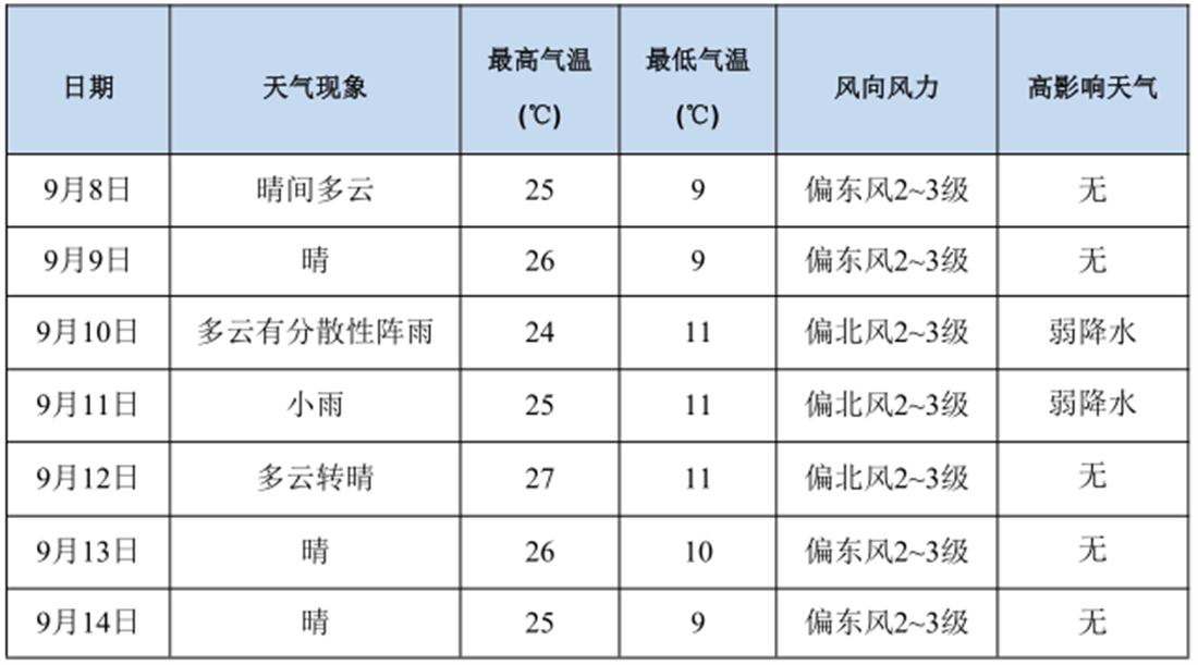 9月8至9日,受偏西气流影响,新区天气以晴为主;10日白天,受切变线影响,新区有分散性阵雨;11日,受副热带高压影响,新区有降水天气;12至14日,受西北气流影响,新区天气转晴。