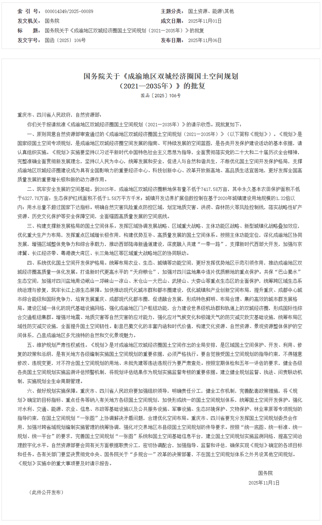 国务院批复同意《成渝地区双城经济圈国土空间规划(2021—2035年)》