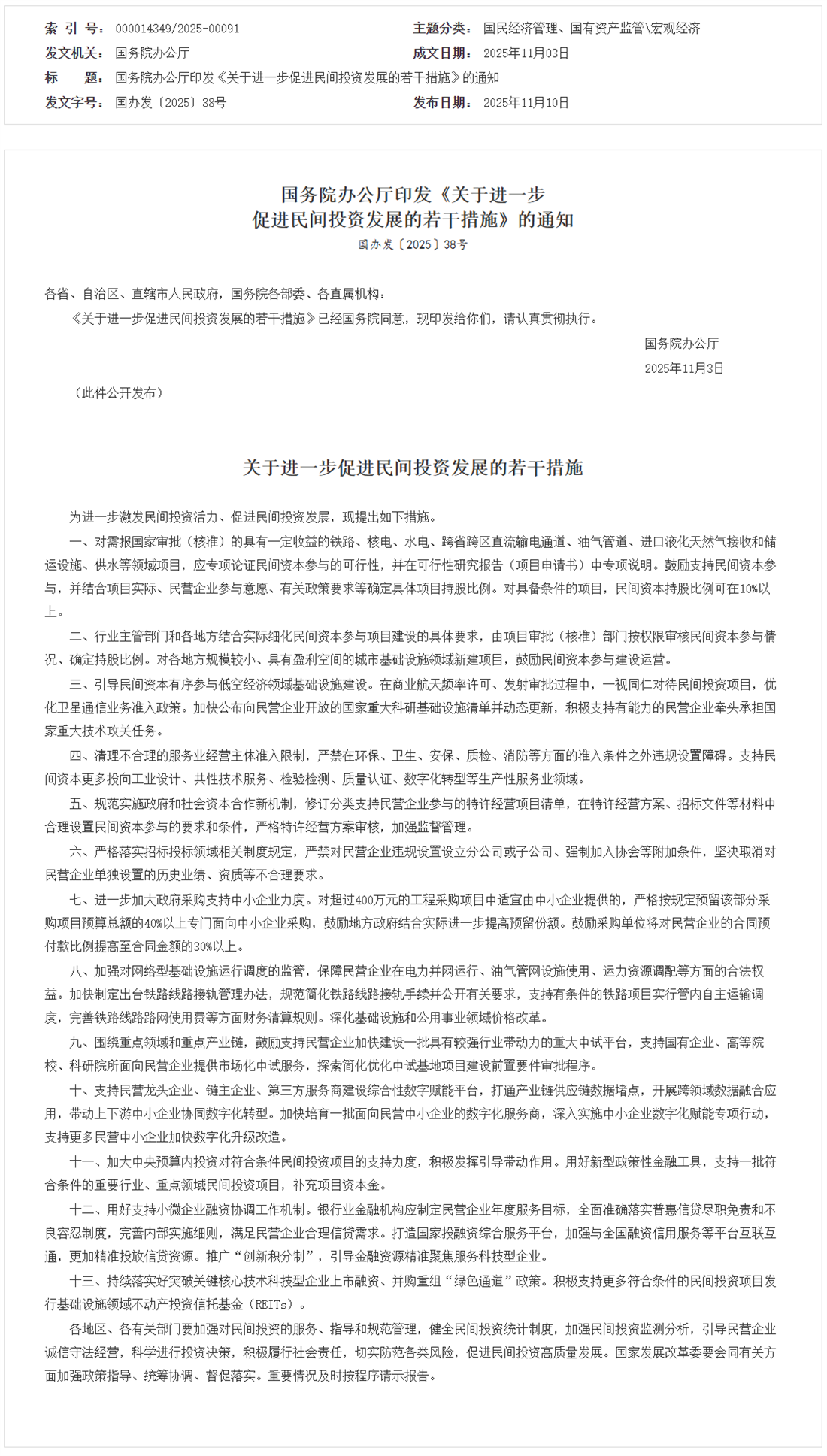 国办印发《关于进一步促进民间投资发展的若干措施》
