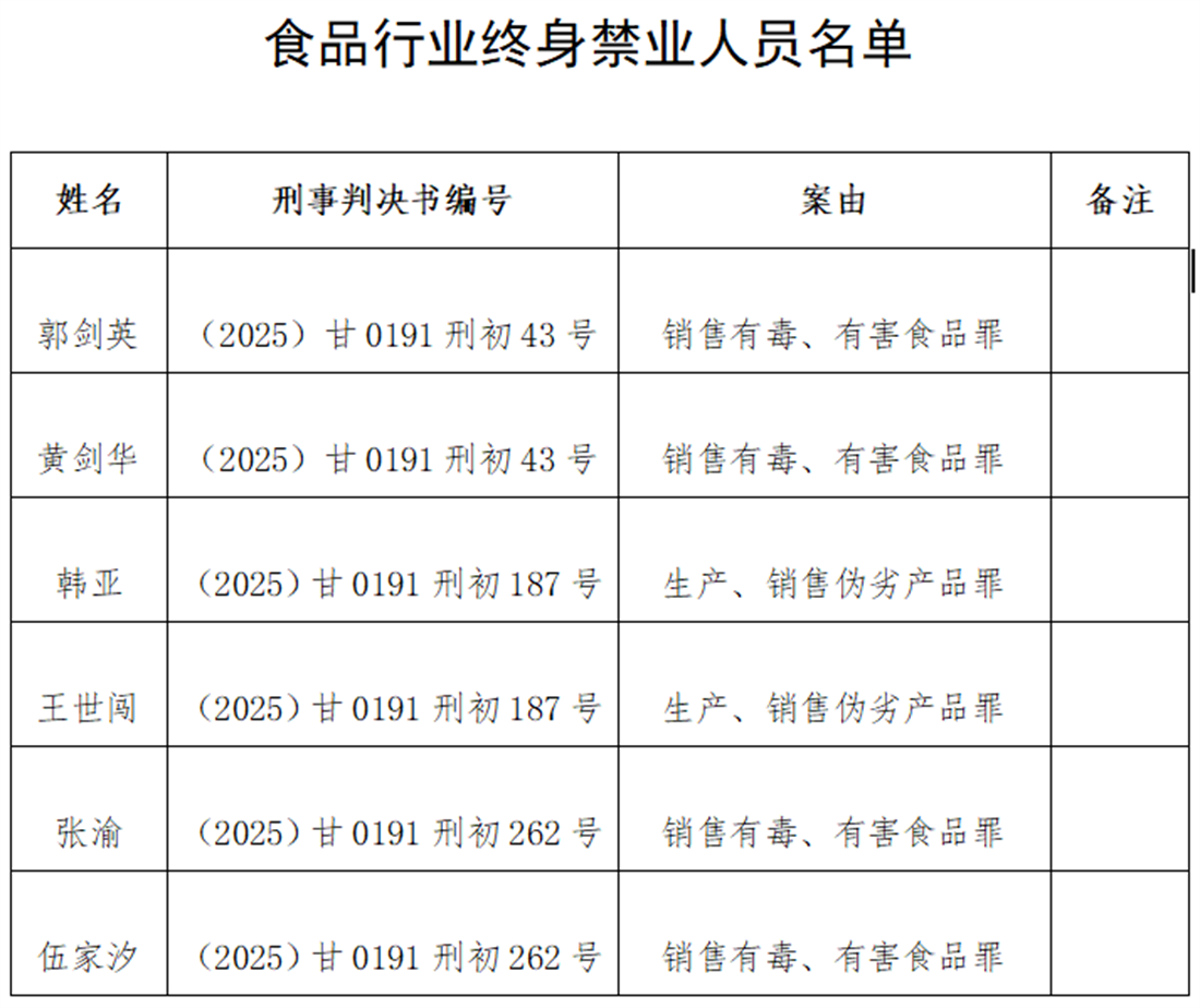 郭剑英等6人,因销售有毒、有害食品等行为,被法院判处有期徒刑,依据《中华人民共和国食品安全法》第一百三十五条第二款“因食品安全犯罪被判处有期徒刑以上刑罚的,终身不得从事食品生产经营管理工作,也不得担任食品生产经营企业食品安全管理人员。”的规定,本局对以上6人作出如下从业禁止:终身不得从事食品生产经营管理工作,也不得担任食品生产经营企业食品安全管理人员。