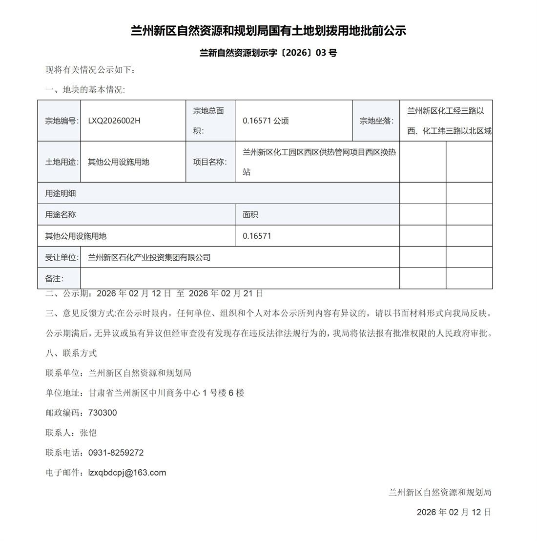 兰州新区自然资源和规划局国有土地划拨用地批前公示