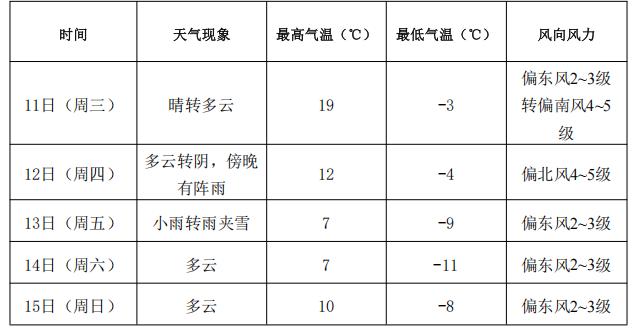 预计3月11至12日上午,受西北或偏西影响,新区天气晴或多云,白天气温较高,其中11日午后至傍晚,有大风天气;12日午后至13日,受高原槽和冷空气先后影响,新区气温明显下降,其中12日午后至傍晚地面风速较大,受上游输入性沙尘及本地扬尘共同影响,有浮尘天气;12日傍晚至13日,新区大部有雨雪天气;14至15日,受冷空气或偏西气流影响,新区云量较多,其中14日清晨气温较低,新区大部有雾或轻雾。