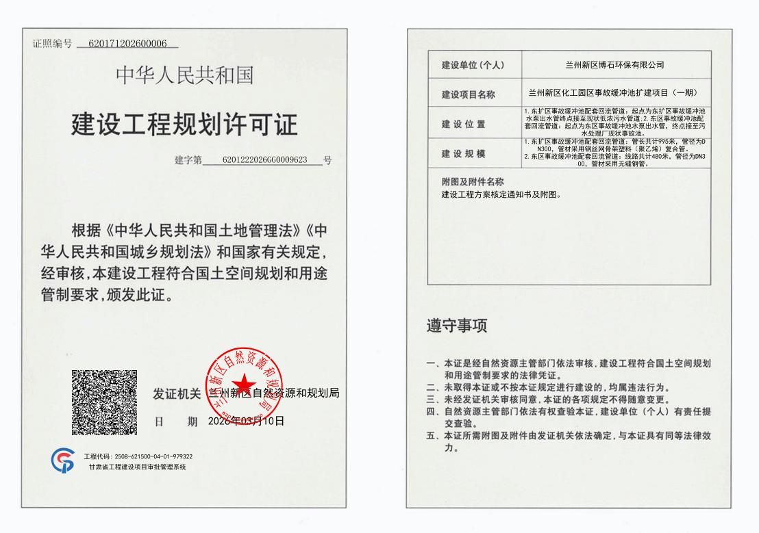 关于公示兰州新区化工园区事故缓冲池扩建项目(一期)配套回流管道《建设工程规划许可证》的公告