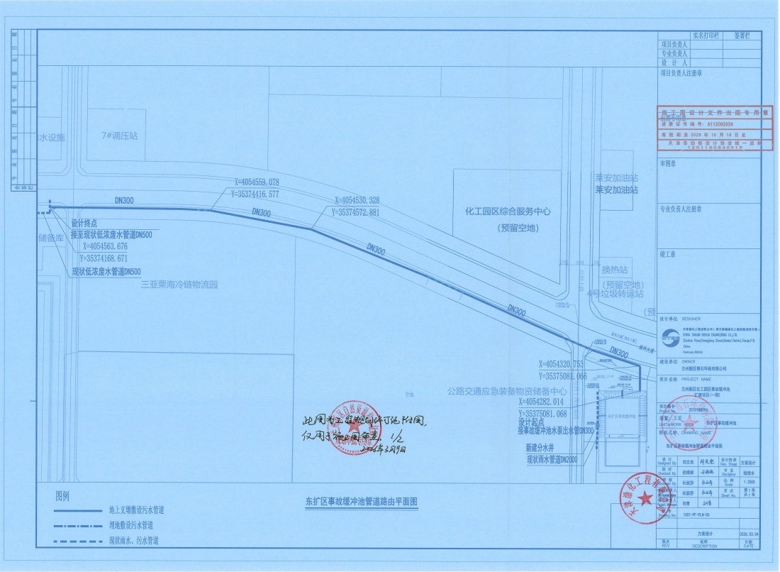 1.东扩区事故缓冲池配套回流管道:起点为东扩区事故缓冲池水泵出水管终点接至现状低浓污水管道;