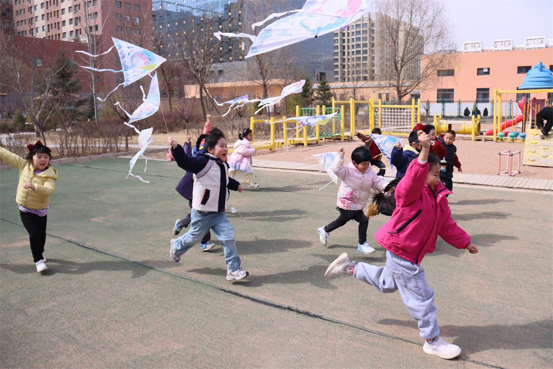 省听力语言康复中心幼儿园的孩子们走出教室,在操场上展开一场“寻找春天”的放风筝主题活动。