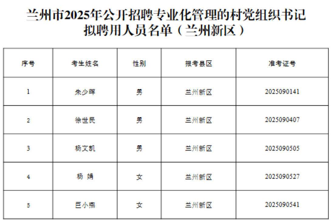 根据《兰州市2025年公开招聘专业化管理的村党组织书记公告》,经资格审查、笔试、资格复审、面试、体检、考察等环节,现将朱少晖等5名拟聘用人员有关情况(详见附件)予以公示,接受广大干部群众监督。公示期间如有异议,可通过电话、来信、面谈等形式反映,我们将认真受理,并向反映问题的干部群众反馈调查核实结果。如不存在影响聘用的问题,公示期满后,将按有关规定办理聘用手续。