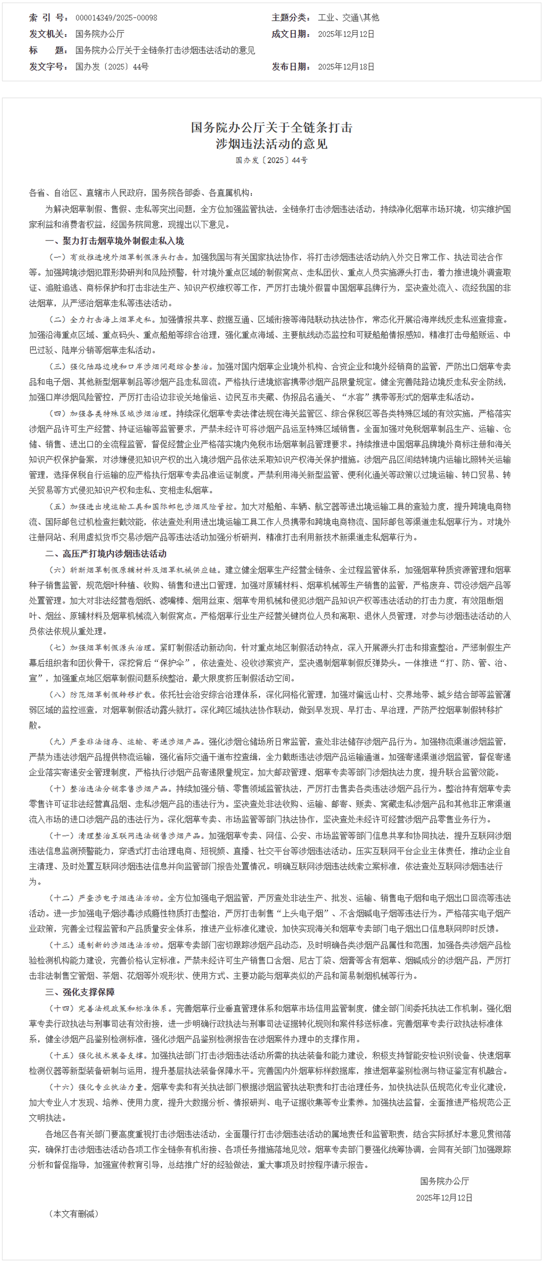 国务院办公厅关于全链条打击涉烟违法活动的意见