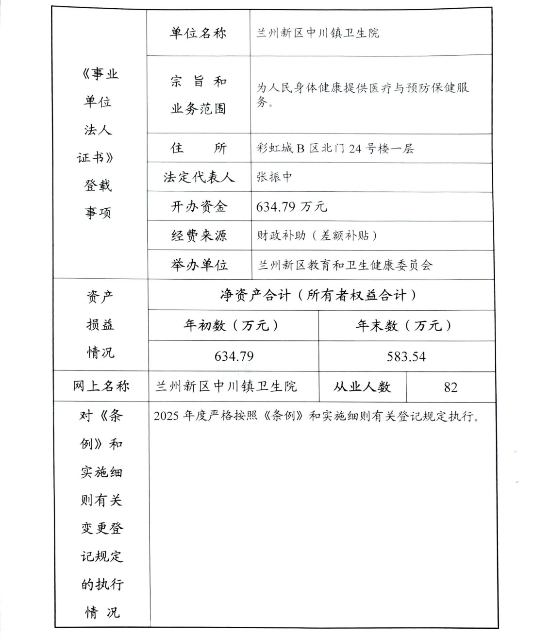 兰州新区中川镇卫生院2025年事业单位法人年度报告书