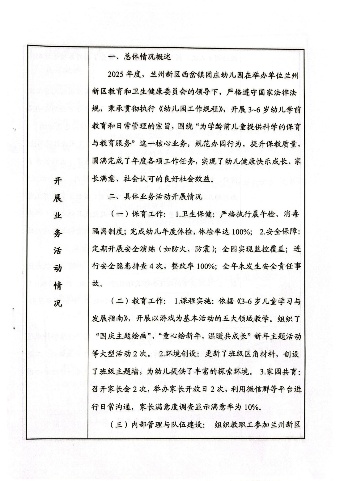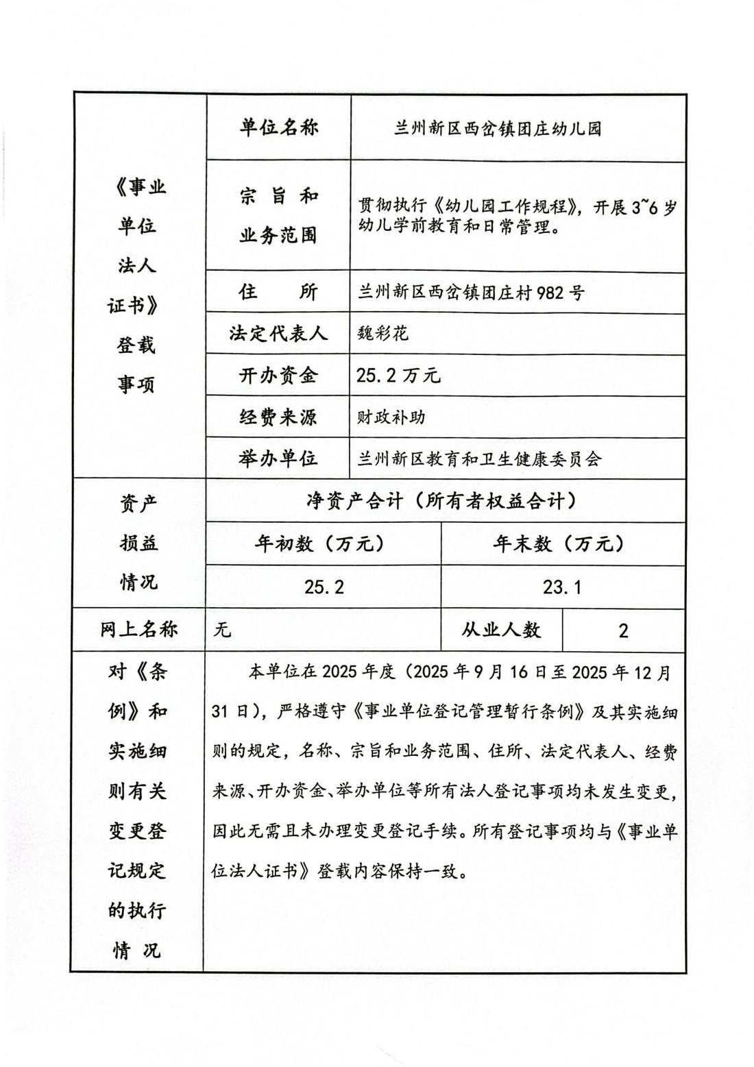 兰州新区西岔镇团庄幼儿园2025年度事业单位法人年度报告书