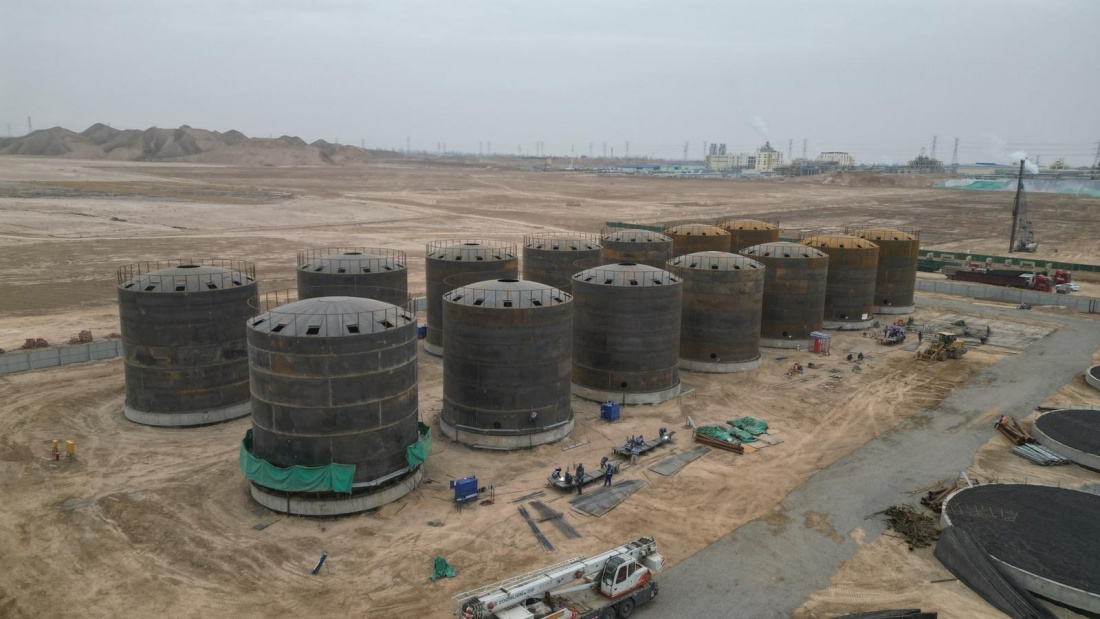 据了解,截至目前,该项目厂前区办公楼、职工食堂、研发中心主体已全部封顶,正在全面开展砌筑及装修作业;生产区1号、2号罐区储罐安装完成50%,后续工序稳步推进。换热站、车间化验室、泡沫站、地磅房、循环水泵房、消防水站等配套设施主体结构均已完工,砌筑工程同步实施;变配电室、中控室、事故水池正加紧主体结构施工;原料仓库、成品库、危废库钢结构主体安装完毕,进入外墙板安装阶段。各节点工程高效推进、闭环落实,为项目早日建成投产奠定坚实基础。