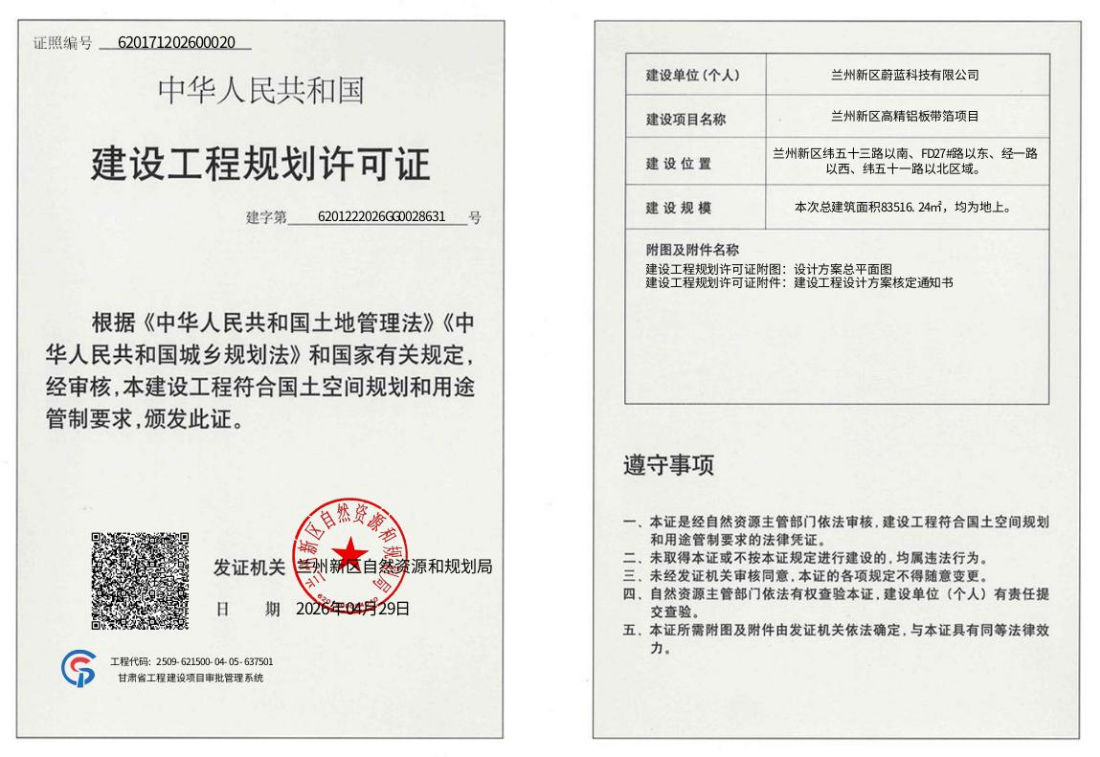 项目地址:兰州新区纬五十三路以南、FD27#路以东、经一路以西、纬五十一路以北区域。发证日期:2026年04月29日