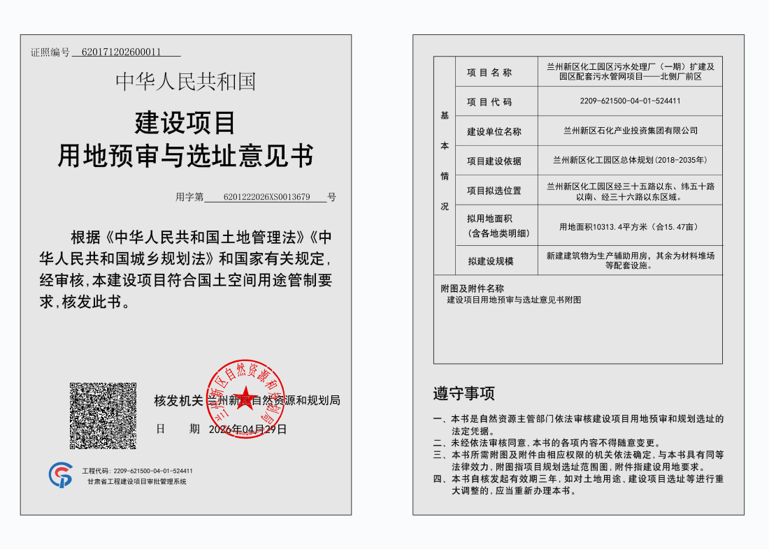 建设项目名称:兰州新区化工园区污水处理厂(一期)扩建及园区配套污水管网项目——北侧厂前区