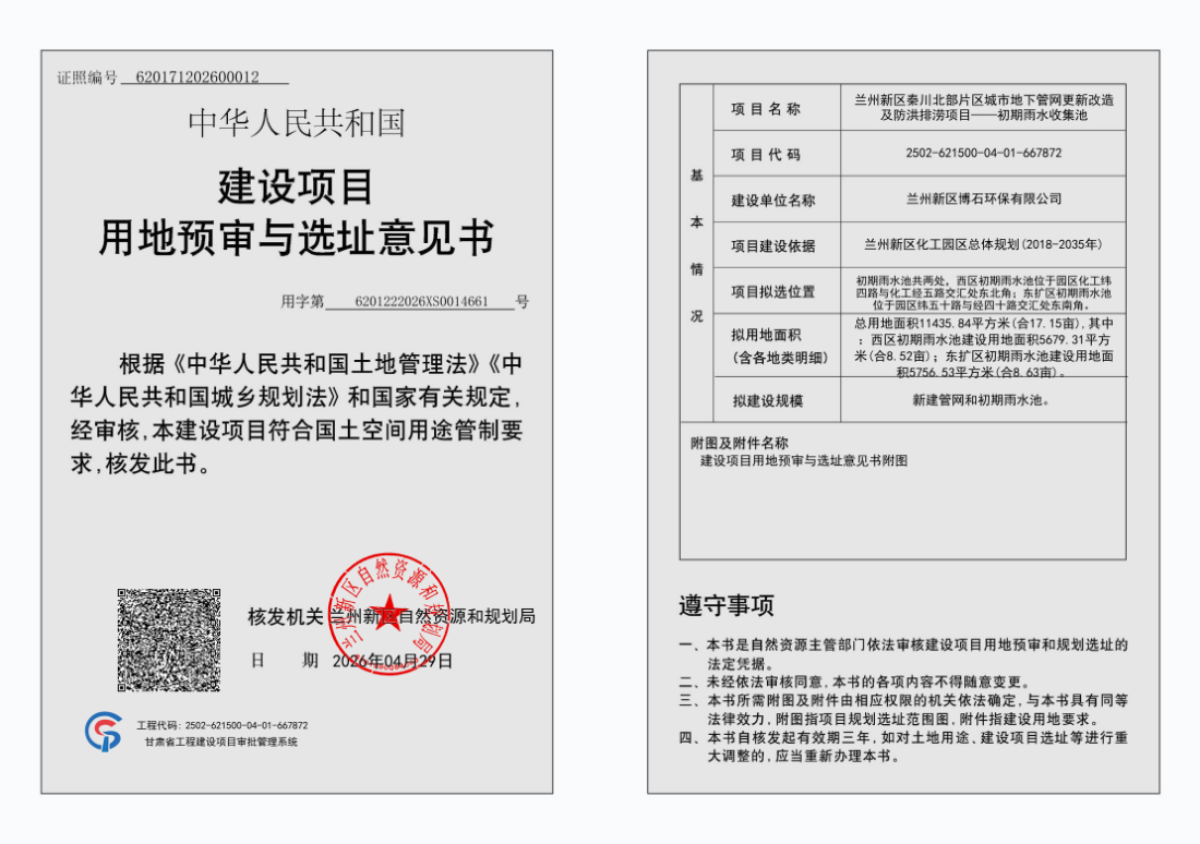 关于公示兰州新区秦川北部片区城市地下管网更新改造及防洪排涝项目——初期雨水池《建设项目用地预审与选址意见书》的公告